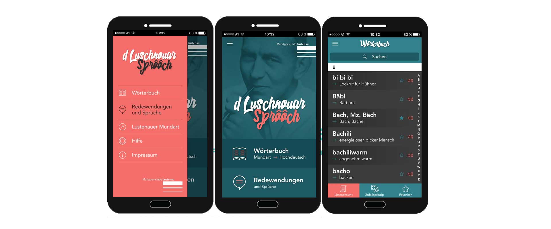 Grundlage des Wörterbuchs ist eine alphabetische Liste aller Begriffe, zusätzlich sollte eine Suchfunktion sowohl für Mundart als auch für Hochdeutsch vorhanden sein. Da die Aussprache sehr schwierig und eine entsprechende Lautschrift für die Lustenauer Mundart nicht vorhanden ist, sollte man sich alle Dialektwörter auch anhören können. Eine weitere Funktion ist der Zufallsgenerator, der ein zufälliges Wort aus der Liste auswählt.